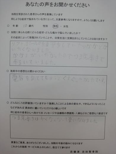 12月の試合に間に合わせるが為、日頃のケア、日常生活の注意点を指導しました