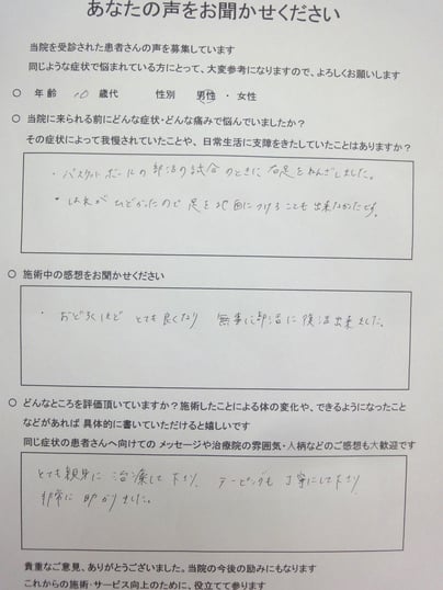 練習後に少し痛みがありましたが、今は改善し練習しています。