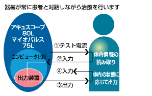 ※一方的に刺激電流を患部に送る電気治療器とは違い、微弱電流治療器は、その方にとって最も効果的な 微弱電流を送ります。
